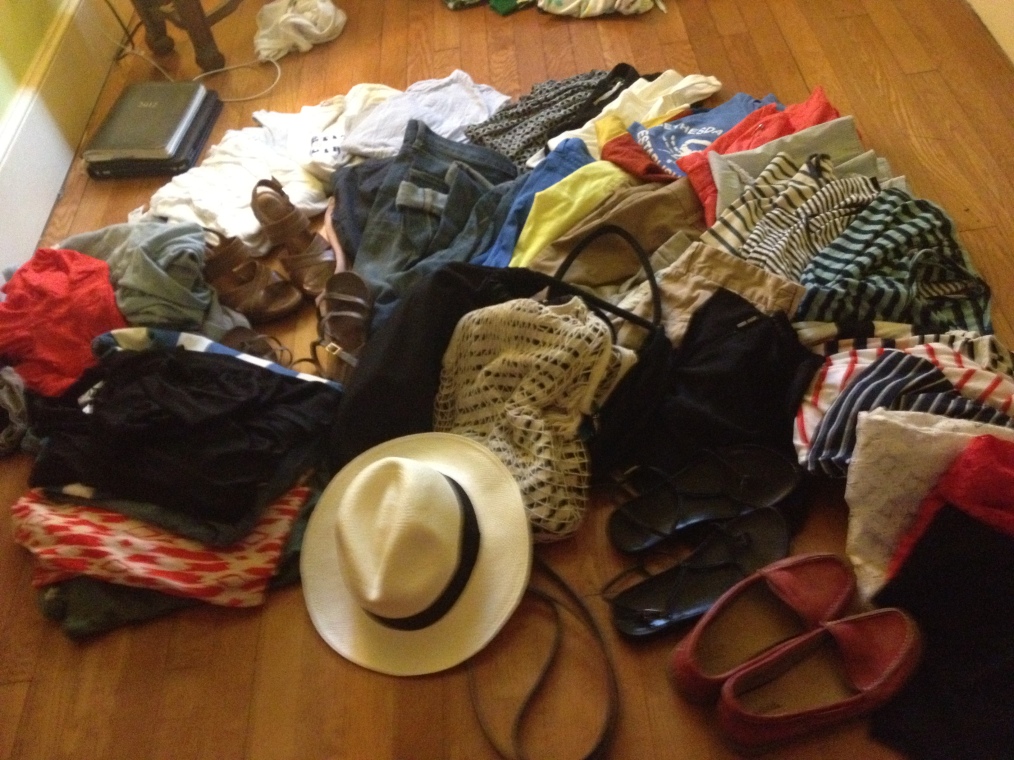1. First, assess your trip. What is weather like where you are going? What are you doing on your trip? Will you be walking a fair amount? Doing outdoorsy activities? Going out to nice restaurants in the evening? Use this as criteria for what you pull out of your closet. We are doing a good deal of traveling the first two weeks we are there — first to the islands and then to the mountains. The last two weeks of our visit we will be in Bangkok. So, my wardrobe has to be somewhat varied, but still all very casual with the exception of maybe one night out with my brother, who runs a prominent nightclub in Bangkok. Plus, I will be running after, hauling, feeding, carrying, etc. three young children. Shoes must be comfortable. And it will be hot. Very. Clothes gotta be lightweight and machine-washable.